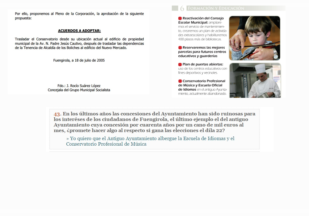 Así, entre las diferentes propuestas que a lo largo de los años han ido planteando los socialistas, siempre en función de los espacios que iban surgiendo en la ciudad y que estaban disponibles o podían estarlo por decisión municipal, han recordado la propuesta del año 2005 de ubicar el conservatorio en lo que era la Tenencia de Alcaldía de Los Boliches (hoy Edificio de Colores) o en el edificio del antiguo Ayuntamiento, compartiéndolo con la escuela de idiomas en el programa electoral de 2011, pasando por alguna propuesta ciudadana a través Programa marco abierto en las elecciones de 2015 que señalaba la parcela municipal colindante con la Mezquita, donde además del Conservatorio, pudiese albergar espacios para creadores musicales.